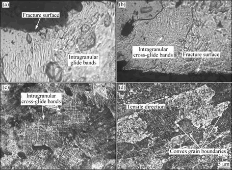 Fig.3 Metallographs of alloy near fracture surface and parallel to rolling surface at different creep temperatures: (a) Slipbands at 125 ℃; (b) Cross-glide bands at 125 ℃; (c) Cross-glide bands at 175 ℃; (d) Convex grain boundaries at 200 ℃