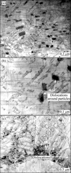 蠕变过程中产生的这些位错一部分缠绕在粗大相粒子周围(见图4(b)),另一部分位错由于受到晶界的阻碍堆积在晶界附近(见图4(c))。
