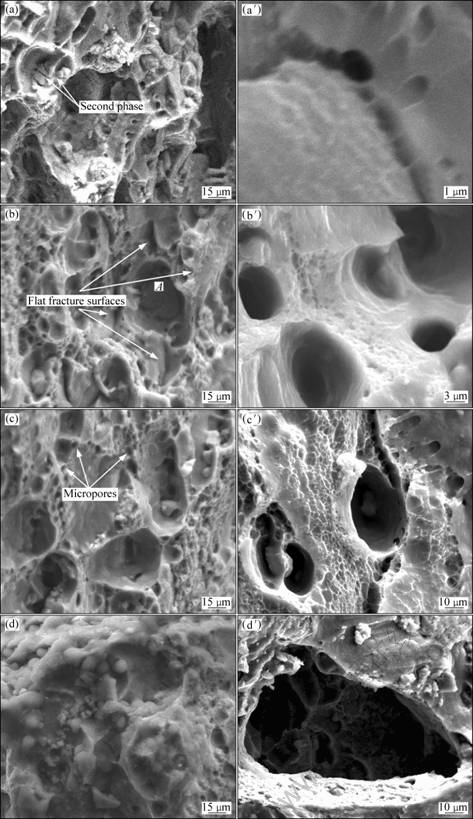 Fig.6 Fractographies of alloy at different creep temperatures: (a) Fractography at 125 ℃; (a′) Micropores at 125 ℃; (b) Fractography at 150 ℃; (b′) Micropores at 150 ℃; (c) Fractography at 175 ℃; (c′) Micropores at 175 ℃; (d) Fractography at 200 ℃; (d′) Micropores at 200 ℃