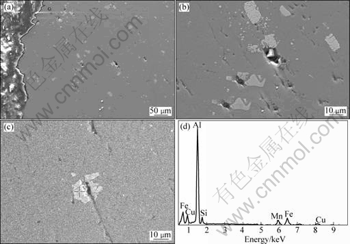 Fig.7 SEM images ((a), (b), (c)) of micropores in 2024-T42 alloy at creep temperature of 150 ℃ and corresponding EDS pattern: (a) Low magnification; (b) High magnification; (c) High magnification showing position of EDS pattern; (d) Corresponding EDS pattern