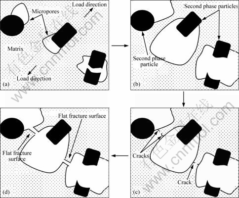 Fig.8 Schematic illustration of fracture mechanism of alloy at creep temperature of 150 ℃: (a) Formation of micropores; (b) Growth of micropores; (c) Formation of cracks between micropores; (d) Rupture