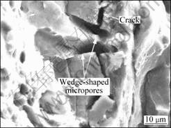 Fig.10 Wedge-shaped micropores on fracture surface of 2024-T42 alloy at creep temperature of 200 ℃