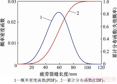 图3 基于疲劳裂缝长度的概率密度函数和累计分布函数曲线