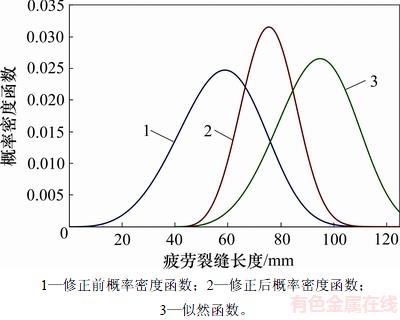 通过引入似然函数得到基于贝叶斯修正的概率密度函数。在疲劳裂缝长度为40 mm即aa=40 mm时进行第1次检测后,采用贝叶斯方法得到的似然函数以及修正前、后的概率密度函数见图6。从图6可以看出:基于疲劳裂缝长度的修正后概率密度函数曲线比修正前初始概率密度函数曲线分布宽度减小,曲线峰值增加。