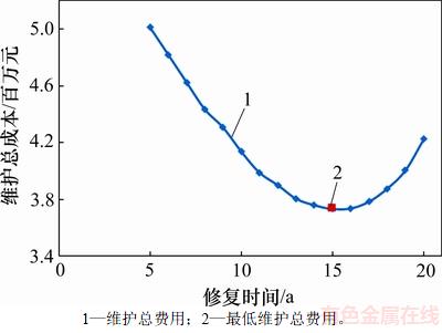 图14 第5年已进行单次检测时,维护总成本与修复时间关系曲线