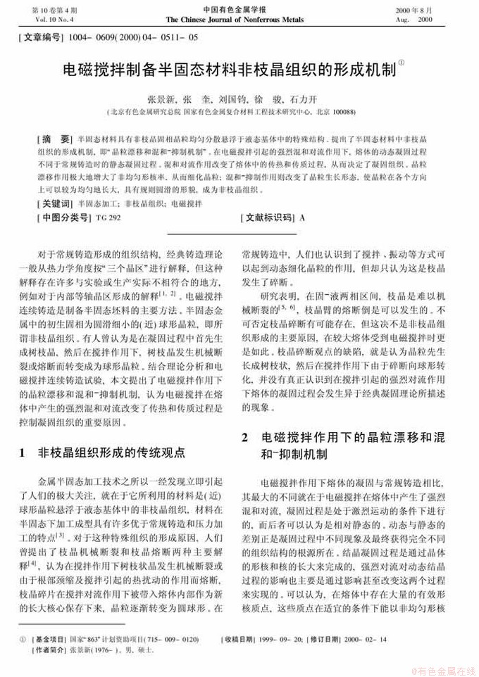 关键词:半固态加工; 非枝晶组织;电磁搅拌