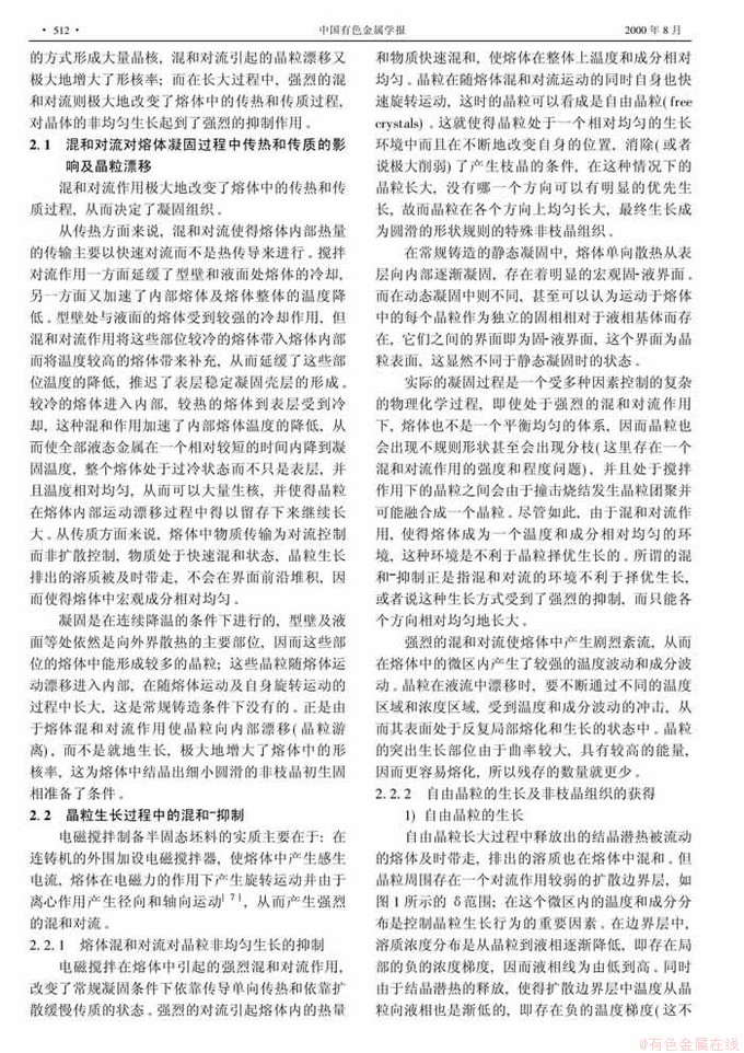 摘 要:半固态材料具有非枝晶固相晶粒均匀分散悬浮于液态基体中的特殊结构。提出了半固态材料中非枝晶组织的形成机制, 即“晶粒漂移和混和-抑制机制”。 在电磁搅拌引起的强烈混和对流作用下,熔体的动态凝固过程不同于常规铸造时的静态凝固过程。 混和对流作用改变了熔体中的传热和传质过程, 从而决定了凝固组织。 晶粒漂移作用极大地增大了非均匀形核率, 从而细化晶粒;混和-抑制作用则改变了晶粒生长形态, 使晶粒在各个方向上可以较为均匀地长大, 具有规则圆滑的形貌, 成为非枝晶组织。