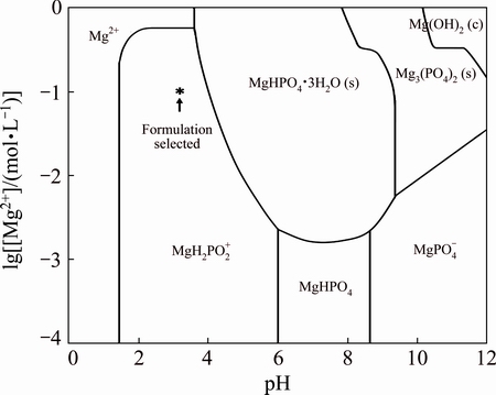 Fig. 1 Thermodynamic stability diagram showing [Mg2+] and pH levels for precipitation of magnesium phosphate compounds, calculated using MEDUSA software package [49] at =0.24 mol/L, [Mg2+] from 10-4 to 1 mol/L and pH from 0 to 12