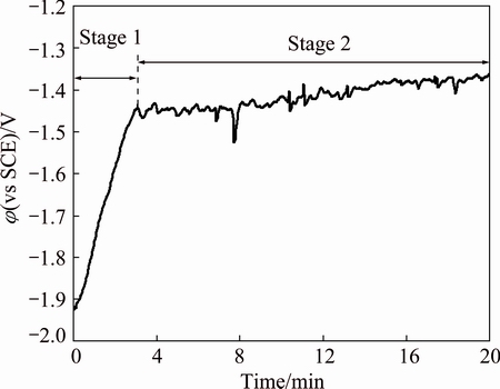 The OCP transient of bare AZ31 in 0.1 mol/L NaCl solution disclosed two stages. In the first stage, within 1 h of immersion, the OCP increased from an initial negative value (about -1.6 V (vs SCE)) towards a more positive value (about -1.38 V (vs SCE)), indicating the formation and growth process of Mg(OH)2 film on the AZ31 surface [3,4]. In the second stage, after 1 h of immersion, the OCP dropped suddenly from -1.38 V (vs SCE) to about -1.4 V (vs SCE), indicating the deterioration of the hydroxide film on the surface, leading to a localized corrosion reaction.