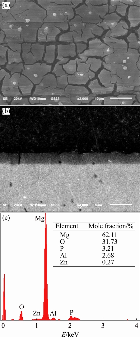 ions, so-called magnesium phosphate conversion coating (MPCC) solution. At present, MPCC has been considered as a novel chemical conversion coating method on carbon steels [43-46]. The former MPCC mainly consists of newberyite (MgHPO4·3H2O) with a thickness of about 30 μm which is about three times thicker than that of zinc phosphate conversion coating and provides two times longer stability under salt-spray conditions [45,46]. PHUONG and MOON [47] and ZHAO et al [48] have investigated MPCC on AZ31 Mg alloy and found that the corrosion resistance of MPCC was much better than that of zinc phosphate conversion coating, and about 20 times better than that of the bare surface. However, these studies are limited in the preparation process of MPCC and simply investigating the corrosion behavior using potentiodynamic polarization test. Thus, further work is required to fully understand the composition and corrosion behavior of MPCC on AZ31 Mg alloy.
