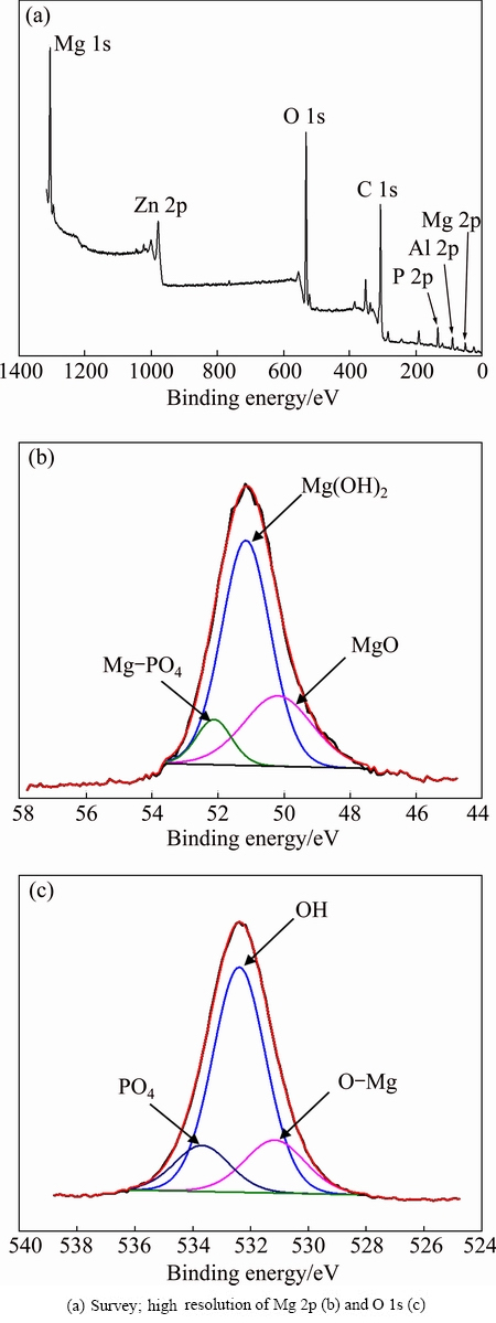 To provide better understanding of the chemical composition of MPCC on AZ31, XPS was used to study the surface bonding of the coating (Fig. 4). XPS survey spectrum of coating found that the main constituents of the coating surface included magnesium, aluminum, zinc, oxygen and phosphorous species (Fig. 4(a)). High- resolution XPS scan (Fig. 4(b)) further shows the Mg 2p binding energies appearing at approximately peaks of 50.19, 51.16 and 52.13 eV, which correspond with the bonding of MgO, Mg(OH)2 and Mg-PO4, respectively. For the O 1s binding energy (Fig. 4(c)), three peaks at binding energies of 531.16, 532.39 and 533.67 eV were fitted, which correspond with the bonding of metal oxide (MgO), hydroxide (Mg(OH)2) and phosphate (PO4) compounds, respectively. Thus, both EDS and XPS analyses indicated that the MPCC on AZ31 was composed of MgO/Mg(OH)2 and Mg-PO4 compounds, such as MgHPO4·3H2O and Mg3(PO4)2.