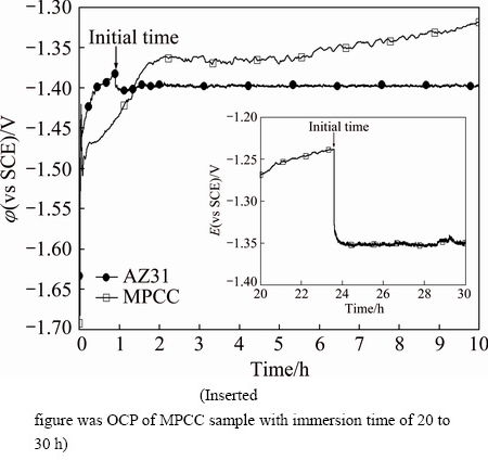 Figure 5 shows the OCPs of bare and MPCC coated AZ31 as a function of time immersed in 0.1 mol/L NaCl solution at 25 °C. The measurement of OCP transients is typically used to study some aspects of the chemical stability and corrosion processes of the surface layers on Mg alloys. It is the most rapid and sensitive way of detecting deterioration processes of the film, and the localized corrosion of Mg alloys in a corrosive solution. Localized corrosion of Mg alloys in an electrolyte containing chloride ions is characterized by the appearance of roughly circular blackened regions (pits), which expand radially with time and vigorously evolve hydrogen [3,4]. The corrosion reaction of Mg alloys in aqueous environments generally progresses by electrochemical reaction with water to produce hydrogen gas and magnesium hydroxide (reactions (7-10)) [3-6]: