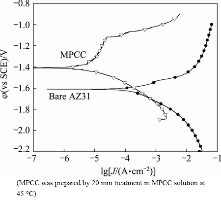 Figure 6 shows the potentiodynamic polarization curves of bare and MPCC on AZ31 obtained after 1 h exposure to 0.1 mol/L NaCl solution at 25 °C. The bare AZ31 surface had a more negative corrosion potential (φcorr=-1.61 V (vs SCE)) than that of the MPCC sample (φcorr=-1.41 V (vs SCE)). The corrosion current density (Jcorr) of MPCC sample was 6.9×10–3 mA/cm2, which was reduced to about 3% of the bare surface (Jcorr=2.23×10–1 mA/cm2). Compared to zinc phosphate conversion coatings, MPCC showed more negative corrosion potential and had a little higher corrosion current density, but the MPCC was much more stable than zinc phosphate conversion coatings against corrosion under the salt-spray conditions, due to its compact coating [47].