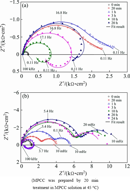 To further understand the corrosion behavior and the associated deterioration process of the bare and MPCC on AZ31, EIS was employed. Figure 7(a) shows the Nyquist plots of the bare AZ31 obtained after 0 min, 20 min, 1 h, 3 h, 10 h and 20 h exposure to 0.1 mol/L NaCl solution at 25 °C. EIS experiments of the bare AZ31 showed two capacitive loops at the high and middle frequencies (HF and MF) in combination with an inductive loop at low frequencies (LF). HF capacitive loops are usually attributed to both charge transfer and surface film effect [50,51]. MF capacitive loops are attributed to the relaxation of mass transport in the growing solid oxide phase. LF inductive loops are attributed to the phenomena of adsorption and desorption of Mg+ species on the surface of the Mg substrate, suggesting the slow corrosion reaction at the interface of AZ31 [11,14,50,51]. The typical EIS experiments of MPCC coated AZ31 consisted of two capacitive loops at HF and MF. According to SEM surface and cross- sectional morphologies, the MPCC on AZ31 consisted of cracks, which reach deeply to the metal surface (Fig. 3). The cracks can be sealed by the corrosion product during immersion in the NaCl solution to form layers: a sealed layer and an unsealed layer. Thus, these two layers correspond to the two capacitive loops of the EIS experiment. The appearance of an inductive loop in the LF region after 24 h immersion is attributed to the localized corrosion of AZ31 due to the deterioration process of the MPCC [52].
