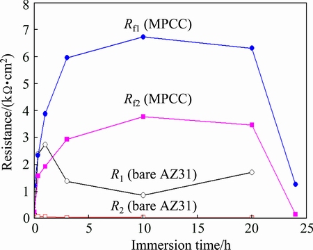 Considering the protective film formed on the bare and MPCC coated AZ31, the magnitudes of R1, R2, Rf1 and Rf2 were plotted with immersion time and shown in Fig. 9. For AZ31, the film resistance (R1) is much larger than the mass transport resistance (R2). The increase of R1 during the first 1 h immersion indicates the growth of hydroxide film on AZ31. However, after an immersion time longer than 1 h, the rapid decrease of R1 indicates the process of deterioration of the hydroxide film, where the localized corrosion occurs on the surface. The slight increase of R1 with immersion time up to 20 h indicates that the surface of the AZ31 was completely covered by the corrosion product.