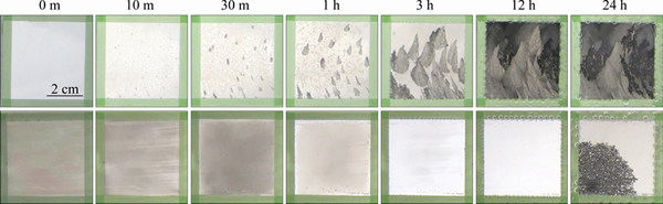 Figure 10 shows photographs of bare and MPCC coated AZ31 with immersion time in 0.5 mol/L NaCl solution at 25 °C. The bare AZ31 showed pitting corrosion with a pit initiation time of about 10 min. The corroded sites rapidly expanded to the entire surface within 3 h immersion. In contrast, the MPCC coated AZ31 showed a filiform corrosion with a much longer pit initiation time of about 24 h. Thus, the immersion test again revealed that the MPCC can significantly increase the deterioration process of AZ31 magnesium alloy in NaCl solution.