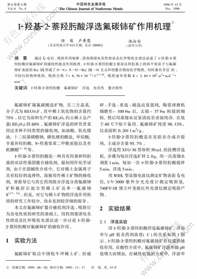 关键词:1-羟基-2-萘羟肟酸; 氟碳铈矿; 浮选; 电负性; 螯合特性
