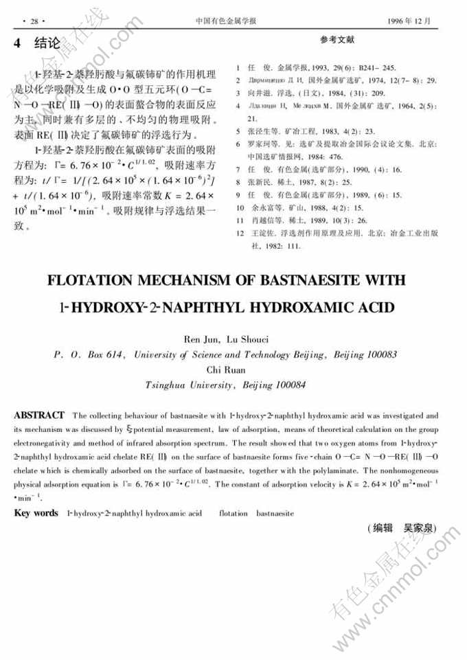 Key words:1-hydroxy-2-naphthyl hydroxamic acid; flotation; bastnaesite