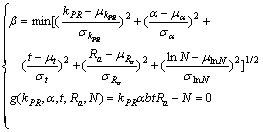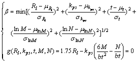 由此将求解可靠度指标β的问题转化为有约束条件下的极小值问题。即在式(12)的约束条件下所确定的可行域内搜索式(11)的最优解,β的最小值即为可靠度指标。