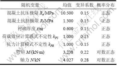上述极限状态方程中,荷载效应N和M的可由蒙特卡罗有限单元法求得,其统计特征可由最大熵原理求得,其他随机变量的值可通过大量的现场调查、试验获得,其统计特征由最大熵原理求得。