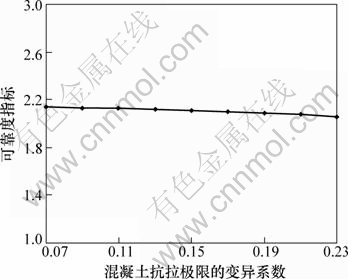 Fig.4 Relationship between variation coefficient of tensile ultimate stress of concrete and reliability index