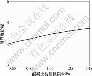 图7 混凝土抗压极限与可靠度指标关系曲线