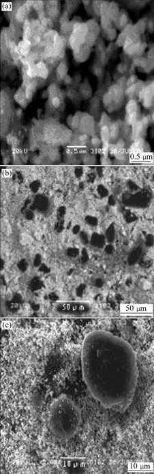 The SEM images of pure Sn-SnSb and Sn-SnSb/ graphite composite powders are shown in Fig.2. The prepared Sn-SnSb multi-phase alloy powders show some degree of agglomeration (see Fig.2(a)). The individual particle size of Sn-SnSb powder is estimated to be about 200 nm. Fig.2(b) shows that the black graphite uniformly distributes in Sn-SnSb powder. Fig.2(c) shows that the spherical graphite is surrounded by Sn-SnSb particles.