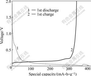 Fig.3 First charge—discharge curves of graphite at current density of 0.1 mA/cm2