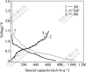 Fig.4 Charge—discharge curves of Sn-SnSb/graphite (20%) for 1st, 3rd and 5th cycles (current density: 0.25 mA/cm2)