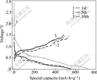 Fig.5 Charge—discharge curves of Sn-SnSb/graphite (50%) for 1st, 5th and 10th cycles (current density: 0.25 mA/cm)