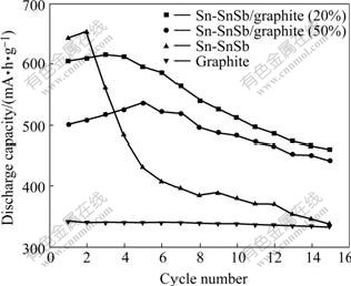 The cycle performances of Sn-SnSb/graphite (20% and 50%), Sn-SnSb and graphite are shown in Fig.7. The discharge capacity of Sn-SnSb/graphite (20%) composite electrode reaches the maximum of 615 mA·h/g in the 3rd cycle and that of Sn-SnSb/graphite (50%) reaches the maximum 536 mA·h/g in the 5th cycle. The discharge capacity of pure Sn-SnSb reaches the maximum of 653 mA·h/g in the 2nd cycle. This may be because the active electrode materials and the complete wetness of electrolyte need some time. After 15 cycles, the discharge specific capacities of Sn-SnSb/graphite (20% and 50%), pure Sn-SnSb and graphite are 461.0, 443.0, 337.0 and 333.6 mA·h/g, respectively. The fading rates of Sn-SnSb/graphite (20% and 50%), pure Sn-SnSb and graphite are 25%, 17%, 48% and 2.19%, respectively. The cycle performance of Sn-SnSb/graphite (50%) is better than that of Sn-SnSb/graphite (20%) regardless of the reversible capacity. The cycle performances of Sn-SnSb/graphite (20% and 50%) are superior to those of pure Sn-SnSb, mainly because graphite can effectively restrain the volume expansion of alloy during the lithium insertion and extraction. In addition, compared with graphite electrode, the join of Sn-SnSb multi-phase alloy greatly enhances the capacity of composite electrode, but the cycle performance is still inferior to graphite electrode.