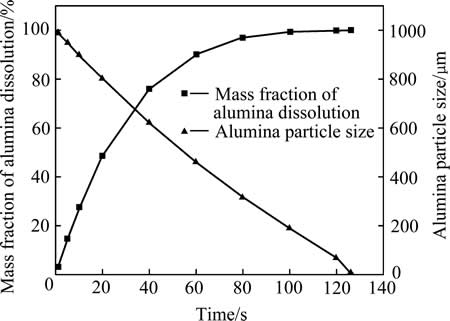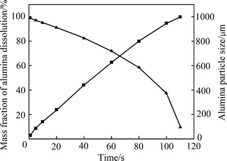 Fig. 6 Accumulated mass fraction of alumina dissolution and particle size change with time under control of heat transfer mechanism