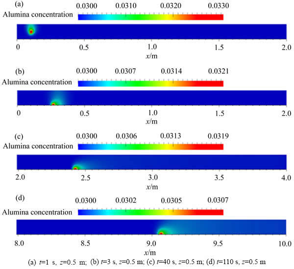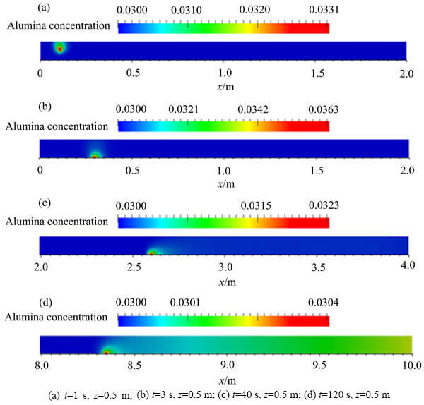 Fig. 7 Alumina concentration distribution at different moments under control of heat transfer mechanism