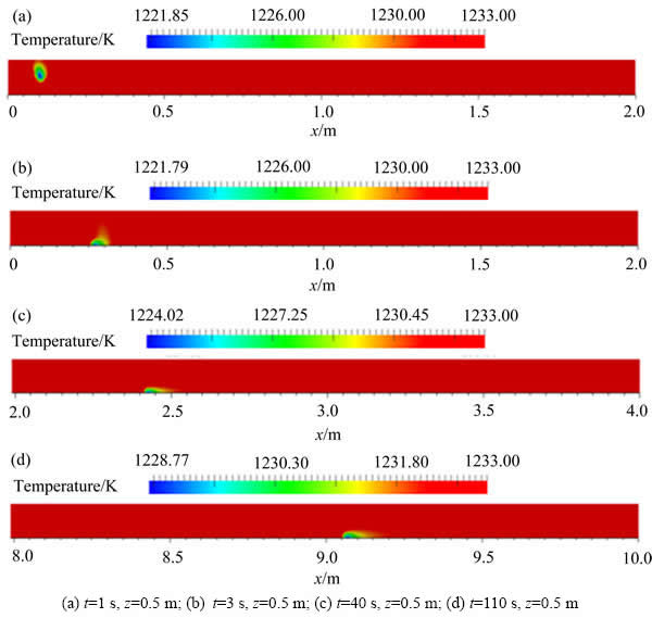 氧化铝溶解吸热会引起电解质温度下降,因此溶解过程中氧化铝颗粒周边电解质温度会下降。图8所示为传热机制控制下不同时刻计算区域电解质温度分布云图。氧化铝颗粒所在单元温度较低,在1 s时该单元电解质温度下降较明显;3 s时颗粒下沉到底部,这段时间内氧化铝继续溶解吸热,吸热量积累使得电解质温度进一步下降,但是下降量不大。当氧化铝颗粒落在底部时,由于电解质流速大于氧化铝颗粒运动速度,温度较低的电解质快速向右侧移动,同时与周围温度高的电解质进行对流换热,右侧电解质温度逐渐升高;在氧化铝颗粒不断溶解过程中,颗粒粒径逐渐减小,质量溶解速率也随之减小,可以看出3 s以后的电解质低温区处于氧化铝颗粒周边,且计算单元最低温度随着氧化铝颗粒的溶解不断升高,110 s时氧化铝已经基本溶解,颗粒周边温度仅下降4 ℃左右。图8中氧化铝周边的温度较其他地方温度低,由式(8)可知,电解质过热度降低会使得氧化铝溶解速率下降,因此在实际生产中为了提高氧化铝溶解速率,要促进因氧化铝溶解而形成的颗粒周边低温电解质的扩散。