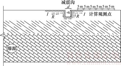 减震沟所处位置位于隧道开挖区和建筑保护区之间。为监测保护区构筑物对隧道爆破的响应,在距爆源水平距离为15~45 m内的保护区地表处每隔5 m设置1个计算观测点,共设置计算观测点7个(见图1)。