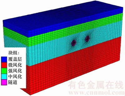 根据工程实际情况,采用FLAC3D软件建立数值计算模型,如图3所示,该模型长×宽×高为160 m× 50 m×60 m。隧道底板位于微风化砂岩层,从地面至隧道顶端依次为填土覆盖层、强风化岩层、中风化岩层,隧道所处的岩层为中风化岩层。