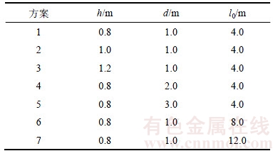 为分析减震沟开挖的深度、宽度、减震沟与爆源之间的水平距离对保护区的减震效果,拟设定7种减震沟方案与无减震沟的方案进行对比,分析减震沟的减震效果。各个方案的减震沟开挖深度(h)、宽度(d)、减震沟与爆源之间的水平距离(l0)等相关参数见表2。