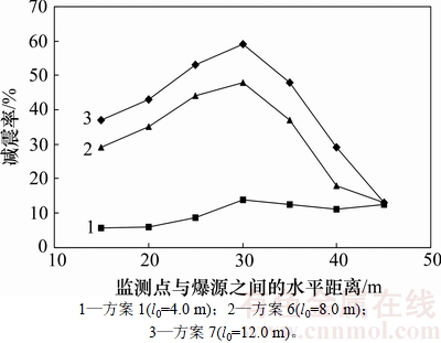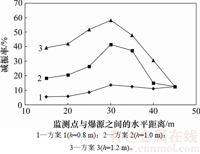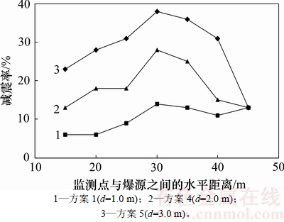 由图9可知:减震沟以方案1、方案4、方案5开挖时,减震沟的减震率随着计算观测点与爆源之间的水平距离增大而呈现先增大后减小的趋势,3种方案的减震率均在计算观测点距爆源30 m时达到最大;方案5减震沟开挖方式(开挖宽度3.0 m)的减震效果最明显,减震率为38%;其次为方案4减震沟开挖方式(开挖宽度2.0 m),其减震率为28%;最后为方案1减震沟开挖方式(开挖宽度1.0 m),其减震率为14%。所以,在减震沟开挖深度以及减震沟与爆源之间的水平距离不变的情况下,在一定范围内,减震沟开挖宽度越大,减震沟的减震效果越明显,但与减震沟的开挖深度相比,减震沟开挖宽度的减震效果较小。