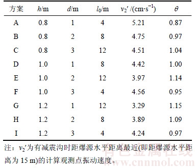 式中:v1为没有减震沟时爆破引起的地表质点振动速度,cm/s;v2为有减震沟时爆破引起的地表质点振动速度,cm/s;K为与爆破地形、地质条件有关的系数;Q为爆破药量,kg;l为爆心距,m;h为减震沟开挖深度,m;α为与爆破地形、地质有关的衰减指数,取0.955。