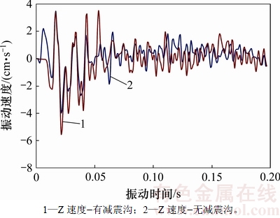 根据上述减震沟正交试验分析结果,依托工程减震沟的优化设计方案如下:开挖宽度为1.0 m,开挖深度为1.2 m,减震沟与爆源之间的水平距离为12.0 m,计算此种减震沟形式下建筑保护区范围内地表计算观测点的振动速度。将计算得到的(计算观测点与爆源之间的水平距离为15.0 m时)振动速度时程图与无减震沟时的计算观测点振动速度时程图进行对比分析,如图12所示。