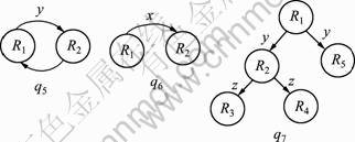 w1,…,wm:R1(w1,z1),…,Rm(wm,zm),R为合取连接关系集。对于每个1≤i≤m,设Ri(xi,yi)为Ti的根结点,其中wi