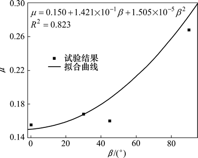 同层理面倾角β的5组数据进行回归分析后得到泊松比与层理面倾角近似呈二次函数关系,且最终拟合方程为: