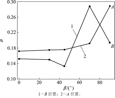 由于本试验采用了如图2所示的应变片粘贴方式,故还可测得每个板岩试样A和B位置的泊松比,并且可以分析所有试样A和B位置的泊松比随层理面倾角的变化规律。不同位置的泊松比μ与层理面倾角β的关系如图6所示。
