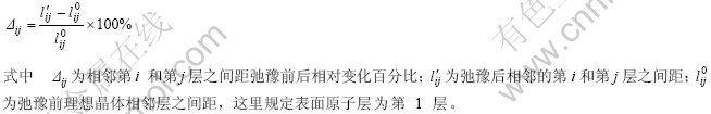 弛豫结果表明,TiB2(0001)表面原子不发生重构,但却有明显的弛豫现象。为了定量描述TiB2(0001)表面原子弛豫情况,定义如下式子: