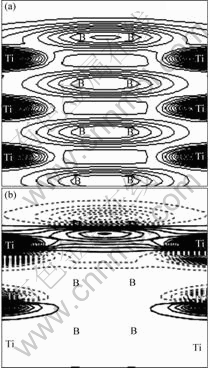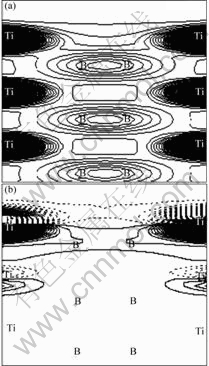 )面驰豫后的电荷分布。可以看出,同一层间的B—B键之间强的共价键作用,以及驰豫后表面层硼原子与其近邻的第二层钛原子之间的相互作用有所加强;图2(b)所示为TiB2(