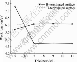 贡献的,这是因为根据TiB2的结构,表面处化学键的截断,对强相互作用的B—B共价键影响较小,而对钛原子的成键情况产生较大影响,导致电子态重新分布。两种表面在费米能级处都具有较高的态密度,说明两种表面都是较活泼的表面。此外,分析了两种表面的功函数,结果如图5所示。表面功函数定义为真空能级与费米能级之差,从图中可以看出,当层厚度≥7层时,两种表面的功函数几乎不再发生变化,这说明此时材料已经具有体材的性质,另外,终止于钛和硼两种表面的功函数分别为4.71 eV和6.07 eV, 终止于钛的表面功函数较低,这是因为正离子在外的表面偶极矩较低。表面功函数是标志表面得失电子能力的一个物理量,与表面的性质有着紧密的联系,两种不同表面功函数存在显著差异,这将会进一步影响其吸附行为。态密度及功函数的信息对进一步分析表面的吸附以及表面的稳定性都具有积极意义。