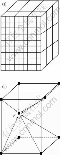 Fig.1 Schematic diagrams of computing temperature field in macro and microcosmic scale: (a) Relationship between macro and micro cells; (b) Interpolation of temperature field