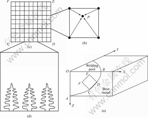 焊接熔池枝晶生长的模拟必须基于焊接温度场进行。枝晶生长的计算基于微观CA单元进行,而宏观温度场的计算以所谓的宏观尺度进行。因此,必须建立宏?微观耦合模型。由于宏观、微观模型分别基于有限差分和元胞自动机方法建立,因此,本文中的宏?微观耦合模型又称为CA-FD模型。