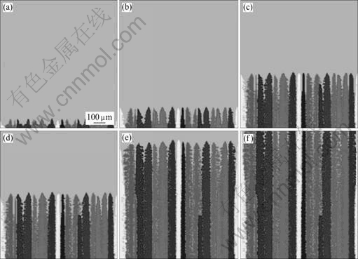 Fig.4 Morphologies of columnar grains in edge of weld pool at different times: (a) 30 000CAs; (b) 50 000 CAs; (c) 90 000 CAs; (d) 120 000 CAs; (e) 150 000 CAs; (f) 170 000 CAs