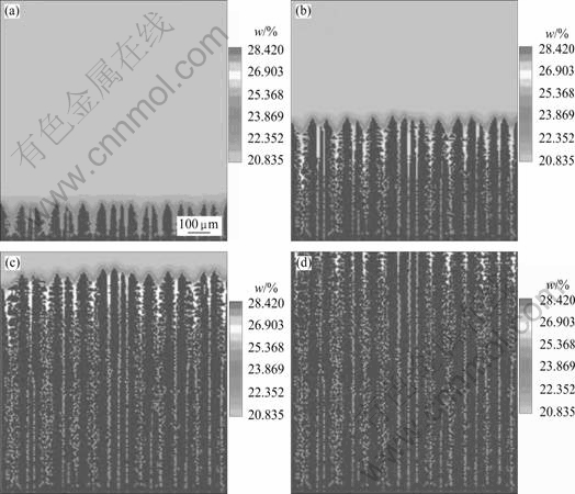 Fig.5 Solute distribution nearly columnar grains at different times: (a) 50 000 CAs; (b) 100 000 CAs; (c) 150 000 CAs; (d) 170 000 CAs